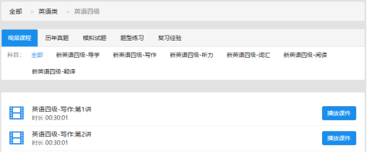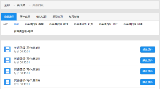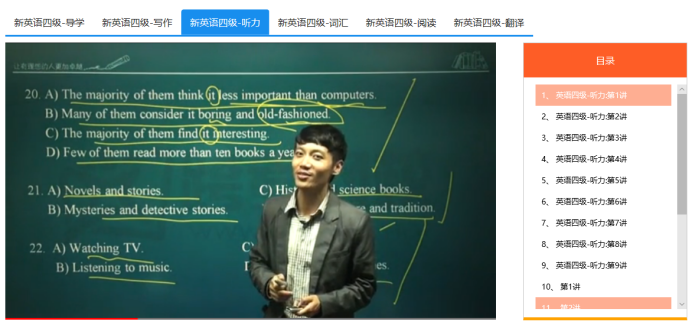 A. 点击 “英语四级 ” 的 “视频课程”,进入视频课程详细页面,页面显示了: