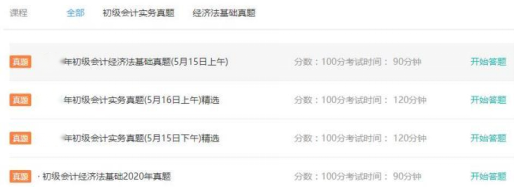 A. 点击“初级会计”的“真题练习”,进入真题练习详细页面,看到该课程的全部真题列表