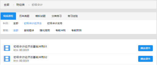 点击 “初级会计”的“视频课程”,进入视频课程详细页面,看到该课程分类和课程列表