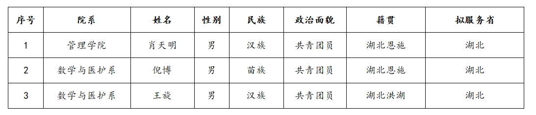 为做好2024—2025年度老员工志愿服务西部计划志愿者招募选拔工作,根据西部计划湖北省项目办招募方案要求,本着“公平、公正、公开”的原则,结合学院工作实际,在自愿报名、资格审查、笔试、面试等环节的基础上,拟增补以下3名毕业生为2024—2025年度老员工志愿服务西部计划志愿者,现将名单予以公示: