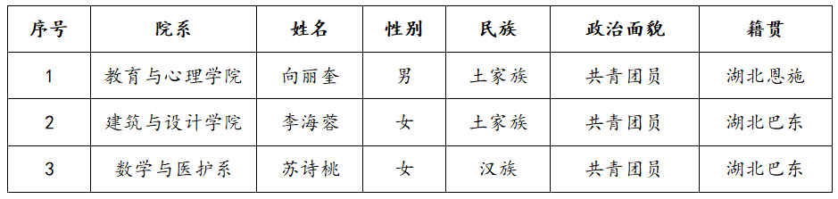 为做好2024—2025年度老员工志愿服务西部计划志愿者招募选拔工作,根据西部计划湖北省项目办招募方案要求,本着“公平、公正、公开”的原则,结合学院工作实际,在自愿报名、资格审查、笔试、面试等环节的基础上,拟增补以下3名毕业生为2024—2025年度老员工志愿服务西部计划志愿者,现将名单予以公示: