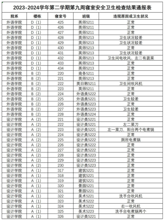 2023-2024学年第二学期第九周寝室安全卫生检查结果通报