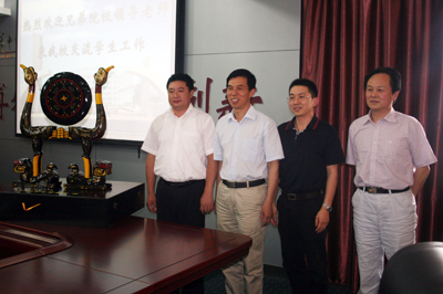 上午,听取了华中师范大学汉口分校副董事长晏永水、学工主任、团委书记的学工经验介绍,下午,在院学工主任彭中同志带领下,同行的其他老师,就员工工作中的一些现实又具体的课题进行了长达三个多小时的深入坦诚的交流,最后汪书记还代表学院向华师汉口分校赠送了虎座鸟架鼓。