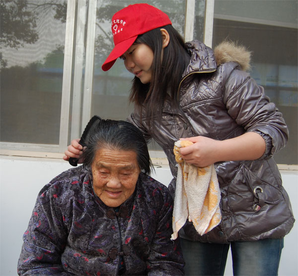外语学部20余名青年志愿者精心准备了文艺节目,一首首经典老歌勾起了老人们的回忆,现场响起热烈的掌声。大家还帮忙老人们打扫卫生,来自英语5091班的李婉玉一边用手轻轻地帮刘奶奶洗头发一边和刘奶奶拉着家常。“水烫不烫?”“在这里生活习不习惯?”“平时有没有什么娱乐活动?镜头前,志愿者们则争着和爷爷奶奶们合影留恋。