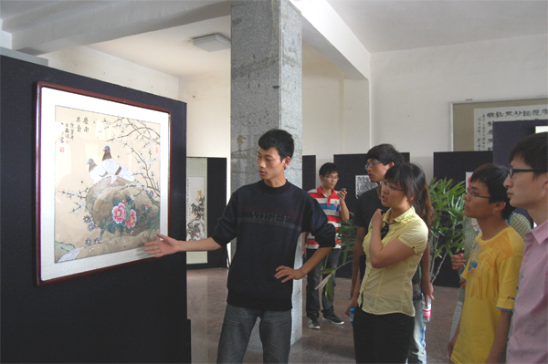 下午四点,交流会结束后,公司书法协会会长秦巨森带领着兄弟学校的朋友们参观了一教大厅前的书画展,同学们纷纷畅谈对艺术的理解,分享独特的创作经验。