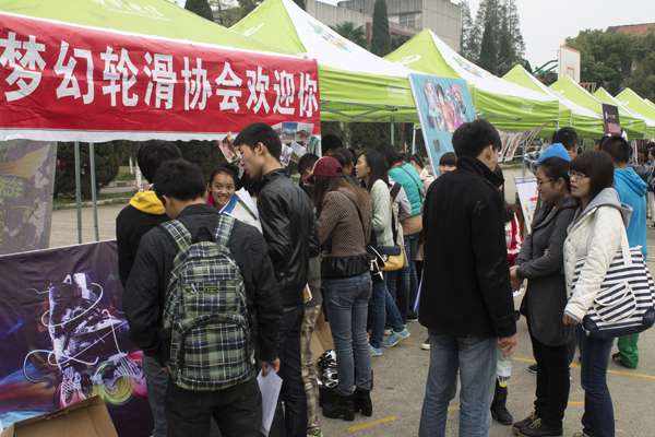 计算机协会的招新平台设在靠近校园正大门的“首位”,协会负责人高调地播放动感音乐,骄傲地向新同学展示技术含量较高的设计成果,让许多爱好者赞叹不已;武术社团则打出强身健体的口号,吸引同学的兴趣;篮球协会不甘示弱,悬挂着超酷的球衣,展板上亮出NBA巨星们的招牌动作,让篮球迷们摩拳擦掌;秋水汉服社里,几位身穿中国传统特色汉服的礼仪小姐一边向同学们展示服装,一边介绍社团优势,她们身上独特的古典韵味让人神往……此外,沙盘社团的沙盘模型,轮滑社摆放的旱冰鞋,羽毛球社陈设的球拍,都吊足了爱好者们的“胃口”。各社团也因这股新鲜血液的注入更显生机与活力。