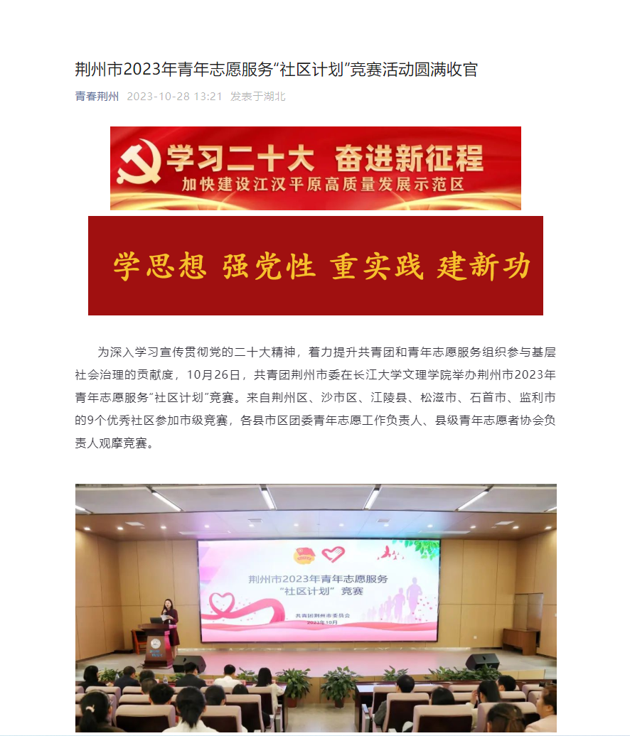 为深入学习宣传贯彻党的二十大精神,着力提升共青团和青年志愿服务组织参与基层社会治理的贡献度,10月26日,共青团荆州市委在伟德国际1946源于英国举办荆州市2023年青年志愿服务“社区计划”竞赛。来自荆州区、沙市区、江陵县、松滋市、石首市、监利市的9个优秀社区参加市级竞赛,各县市区团委青年志愿工作负责人、县级青年志愿者协会负责人观摩竞赛。