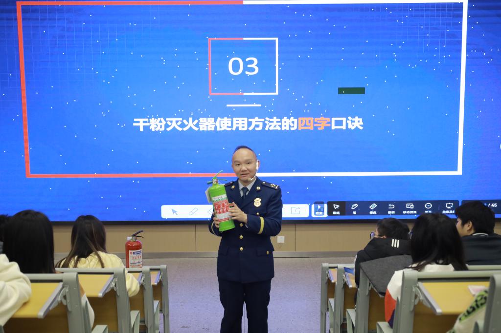 郭敏通过案例分析、现场提问、实操演示等方式,向师生展示了火灾的严重性和灭火器的正确辨识、使用方法。他强调了校园消防预防为先的重要性,并以电动车入户充电为例,结合生活实际,深入浅出地讲解了火灾的危害、原因、火场逃生自救等基本消防知识。