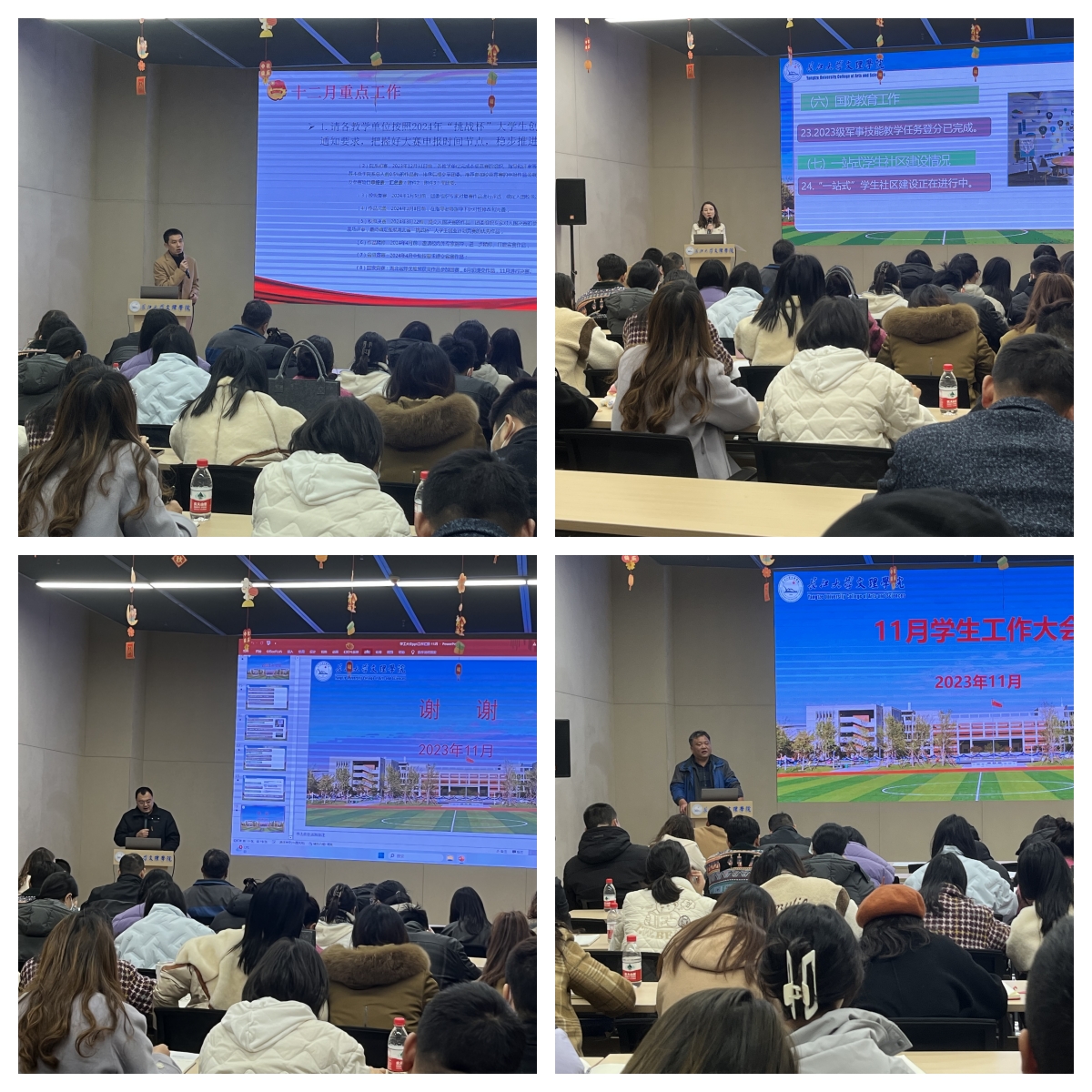 接着,陈海波将11月份团委已开展工作用数据和图表进行详细的展示,并对接下来的常规工作和重点工作进行了明确部署。李刚英汇报了员工工作部11月份已开展的工作,并部署了近期的工作安排。沈爱龙通报了学院近期的诈骗事件,并强调了提高员工反诈意识的重要性。