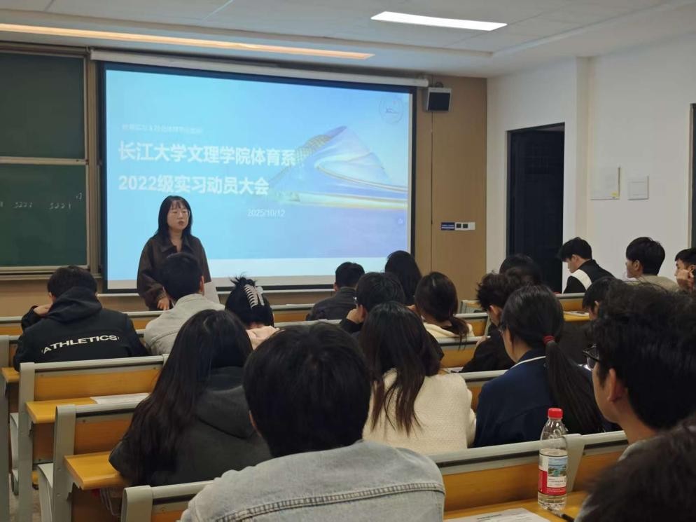 为保障实习工作安全推进,体育系组织召开实习动员大会,由体育实践教研室主任黄贝主持。会上,体育系党总支副书记赵婉君强调实习员工安全工作,指出“安全是实习底线和前提”,要求实习生树立安全意识,教学实习中关注体育教学特殊性,做好防护,杜绝运动伤害事故。