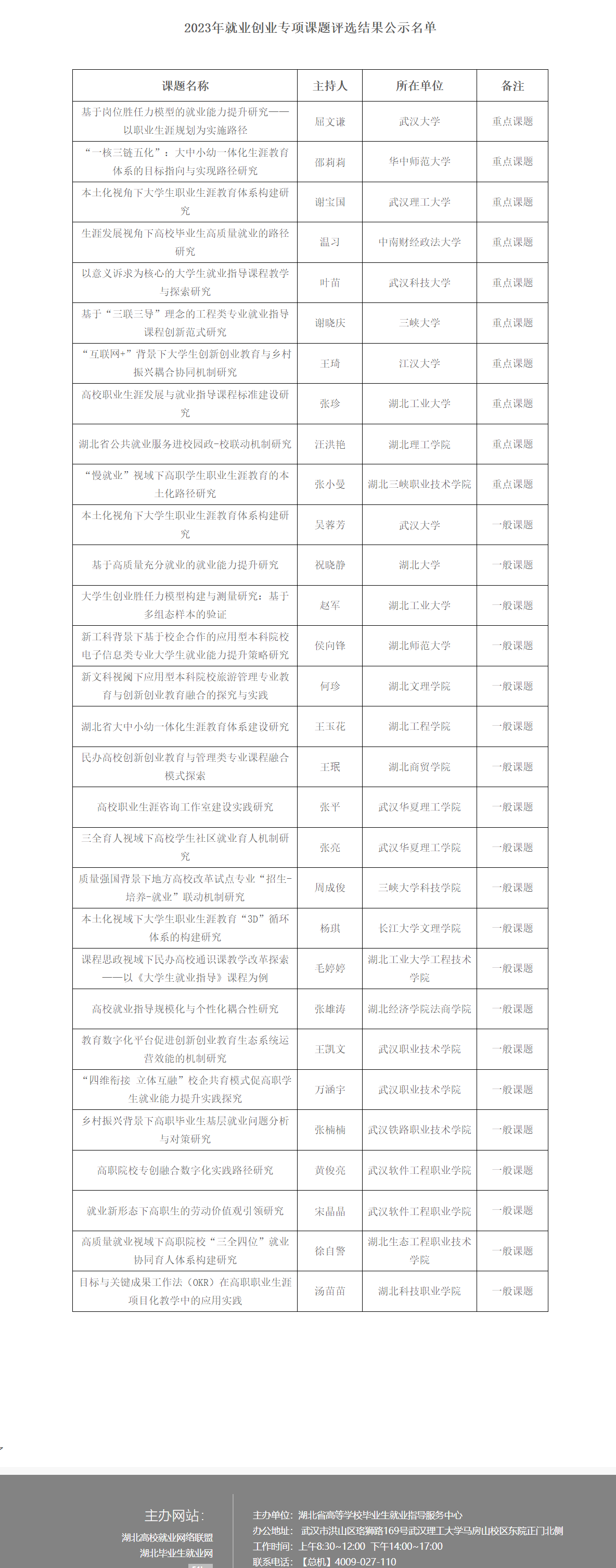 根据《关于开展2023年湖北省高校毕业生就业创业专项课题研究申报工作的通知》精神,经个人申报,高校审核推荐,专家评审,现将2023年湖北省高校毕业生就业创业专项课题评审结果予以公示。公示期自2023年7月20日至2023年7月27日。若有异议,请于公示期内以电话、书面材料或电子邮件反映,并提供必要的证据材料,以便核实查证。提出异议者请提供本人有效联系方式。
