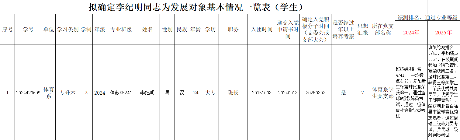 经党支部培养教育和考察,在听取培养联系人、党员和群众意见的基础上,经支部委员会研究,报上级党委备案同意,将李纪明同志列为发展对象。为保证发展新党员的质量,加强对发展党员工作的民主监督,现将发展对象有关情况进行公示。