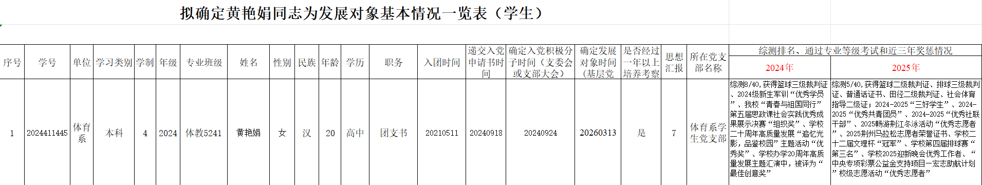 附:拟确定黄艳娟同志为发展对象基本情况一览表