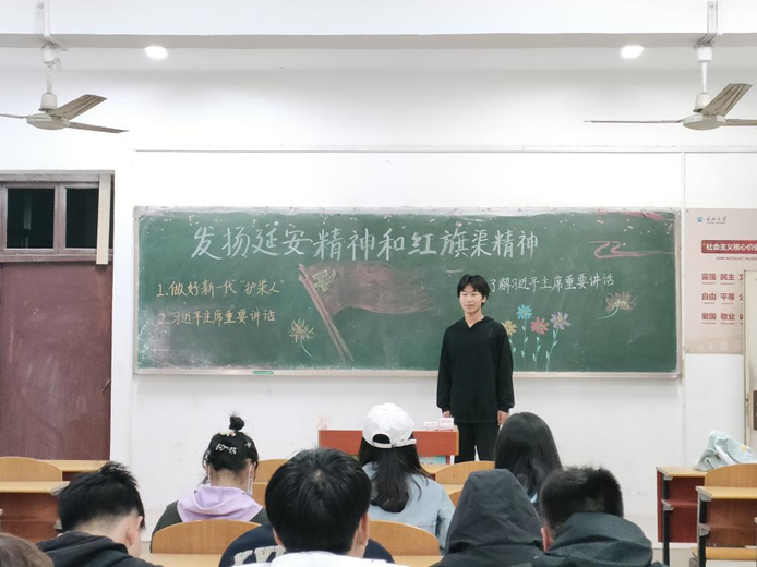 第二部分围绕习近平总书记的重要讲话,团支部播放了有关习近平总书记重要讲话的音视频,当年毛泽东同志等老一辈革命家在延安,住窑洞、吃粗粮、穿布衣,用“延安作风”打败了“西安作风”。全党同志要把老一辈革命家和共产党人留下的光荣传统和优良作风传承好发扬好,勇于推进党的自我革命,坚定不移推进全面从严治党,始终保持党的先进性和纯洁性,确保党始终成为中国特色社会主义事业的坚强领导核心。红旗渠精神同延安精神是一脉相承的,是中华民族不可磨灭的历史记忆。鄂豫皖苏区根据地是我们党的重要建党基地,焦裕禄精神、红旗渠精神、大别山精神等都是我们党的宝贵精神财富。开展主题教育,要让广大党员、干部在接受红色教育中守初心、担使命,把革命先烈为之奋斗、为之牺牲的伟大事业奋力推向前进。团支部对于习近平总书记的重要讲话向同学们提出观后感,同学们积极回答问题,发表了自己内心深处最真实的感慨以及如何学习这种精神。