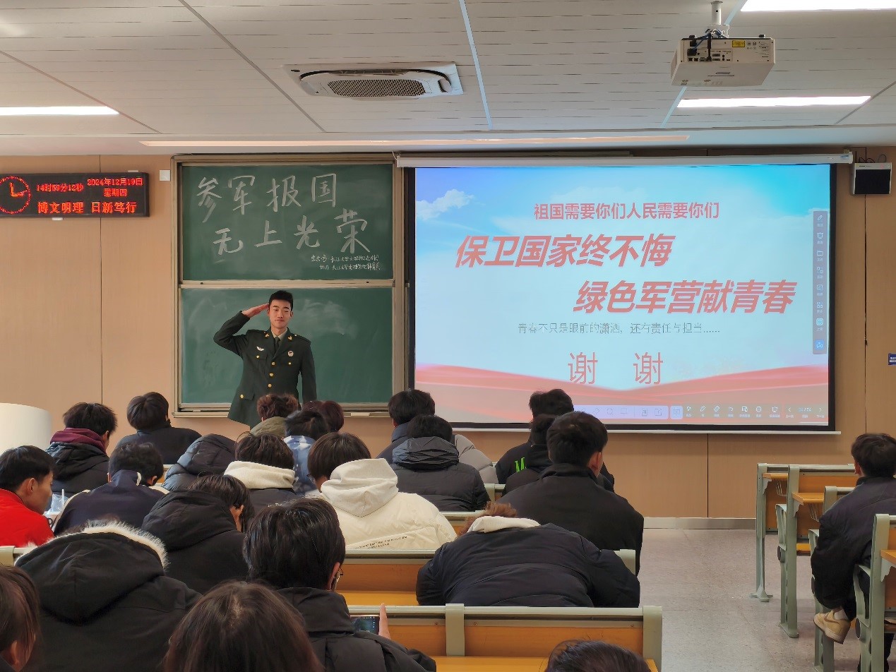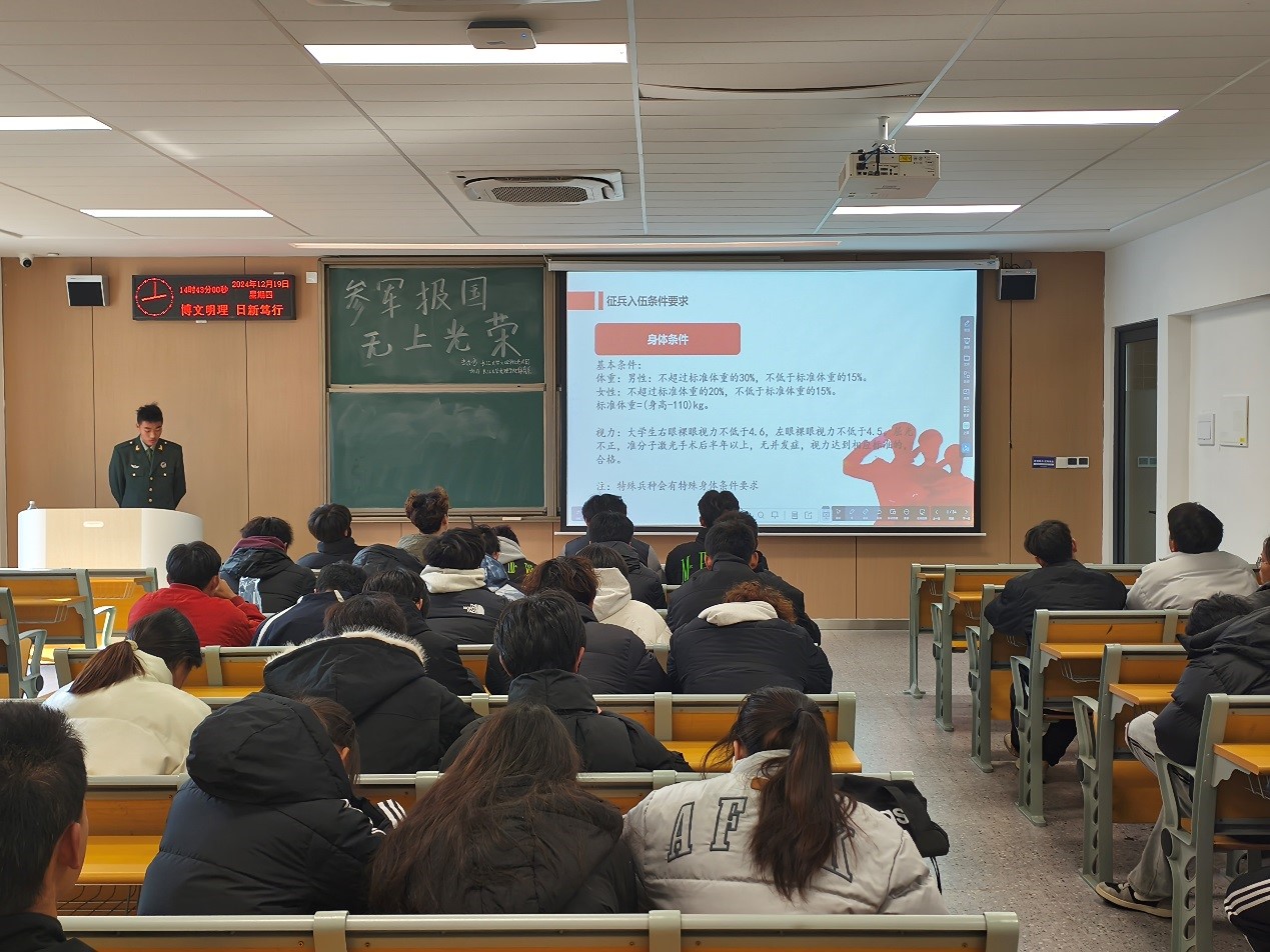 本网讯(通讯员 王艺林)为进一步推进2025年征兵工作,动员和鼓励青年学子积极响应国家号召,投身国防事业,为实现中国梦、强军梦贡献青春力量,体育系于2024年12月19日14点30分在教学楼A-210举办主题为“参军报国,无上荣光”的征兵宣讲会。此次宣讲会由校老兵团成员郑灿主讲。