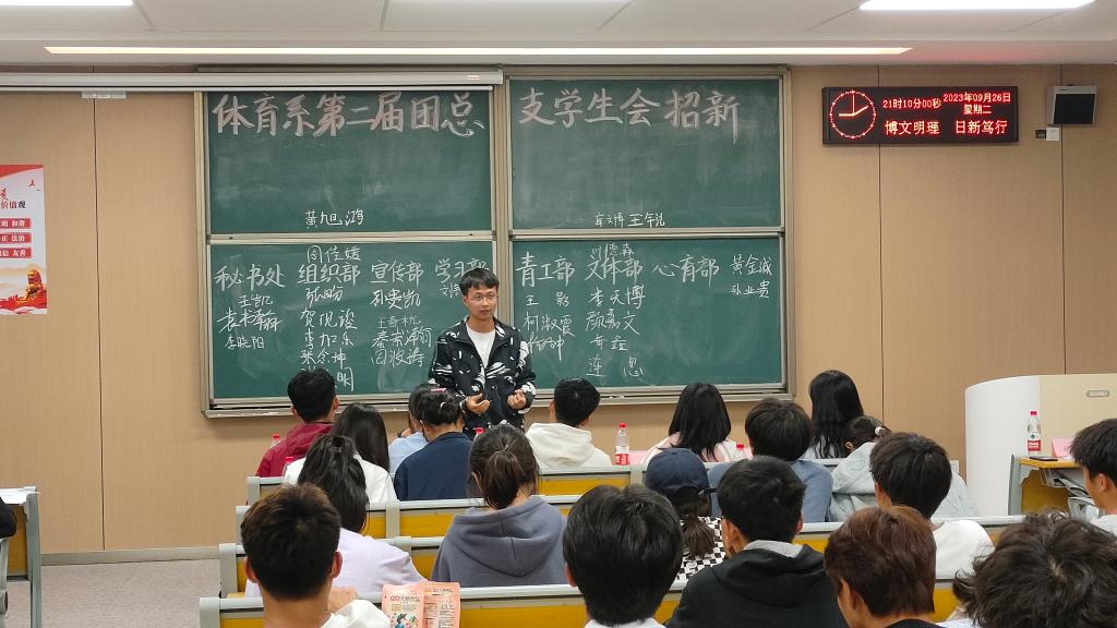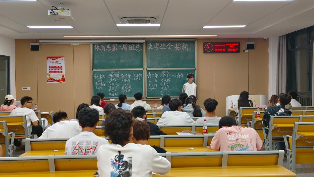 (通讯员:张欣) 2023年9月27日晚上七点,体育系第二届团总支员工会招新大会在教学楼C栋323教室举行。参加本次大会的有体育系辅导员门世豪老师、体育系团总支副书记任萌茹、第二届员工会主席团及各部门部长和参加本次竞选的28位候选人。竞选大会开始前,辅导员门世豪老师首先鼓励同学们充分准备,大胆发言,同时也希望大家在本次竞选中能端正态度,以一个良好的心态面对结果。