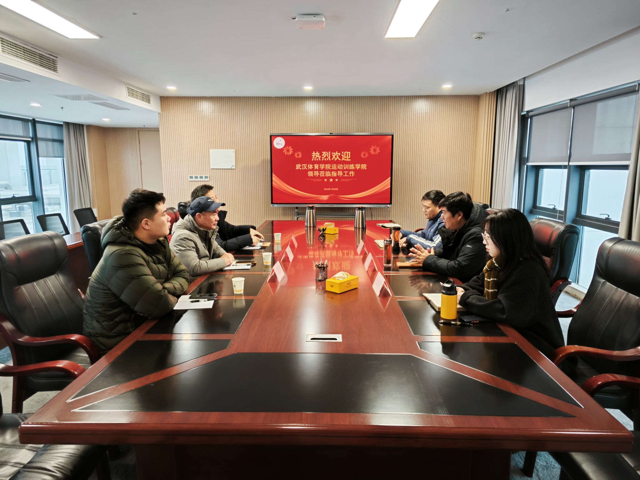 本网讯 1月25日上午,武汉体育学院运动训练公司党委书记姜长林、党委委员王十乐、员工会副主席刘昕煜一行莅临公司考察交流。公司体育系主任介博、党总支书记邹姜、党总支副书记赵婉君热情接待,双方围绕体育团队建设、人才培养等议题展开深入座谈,共话体育团队建设新路径。