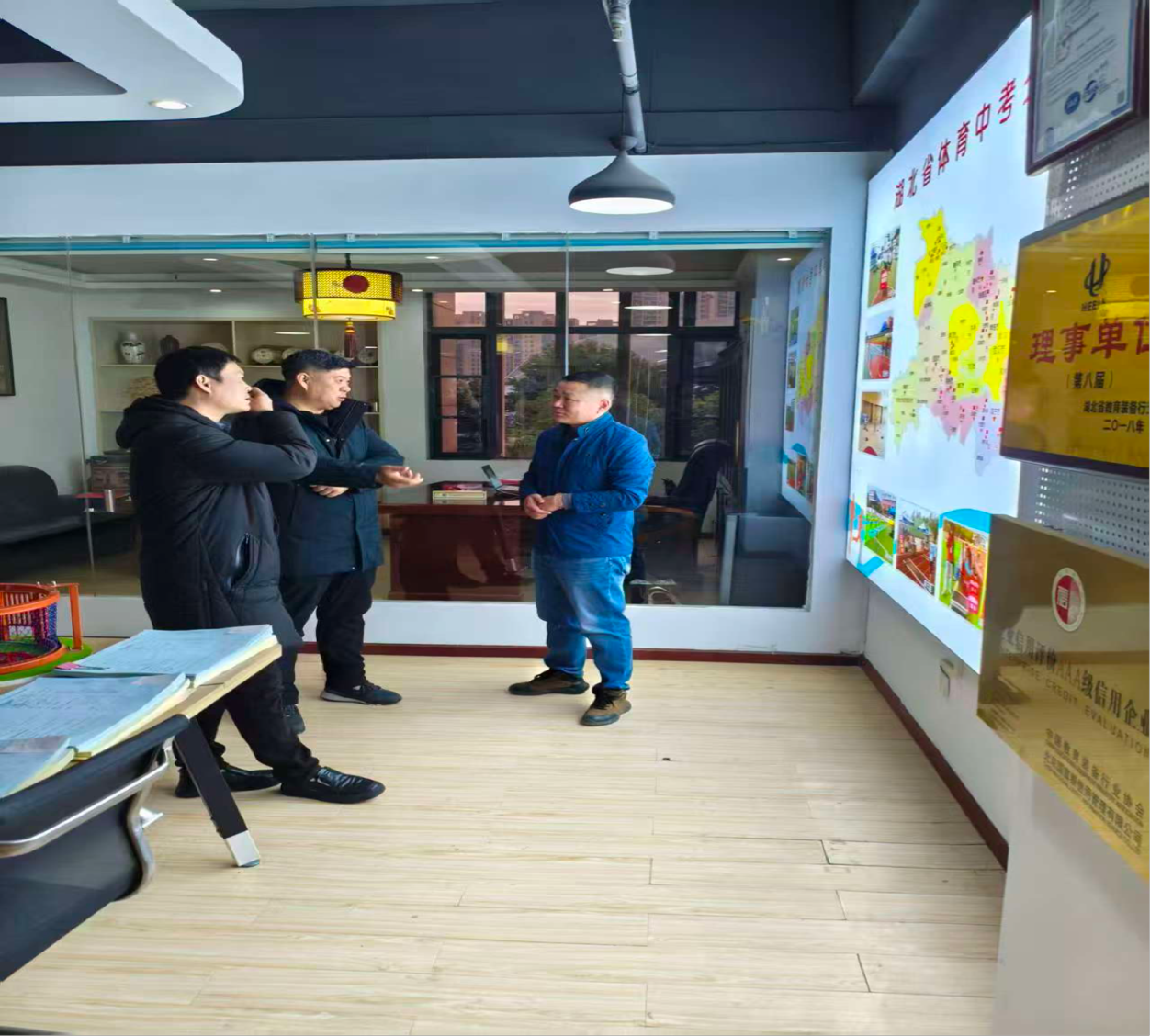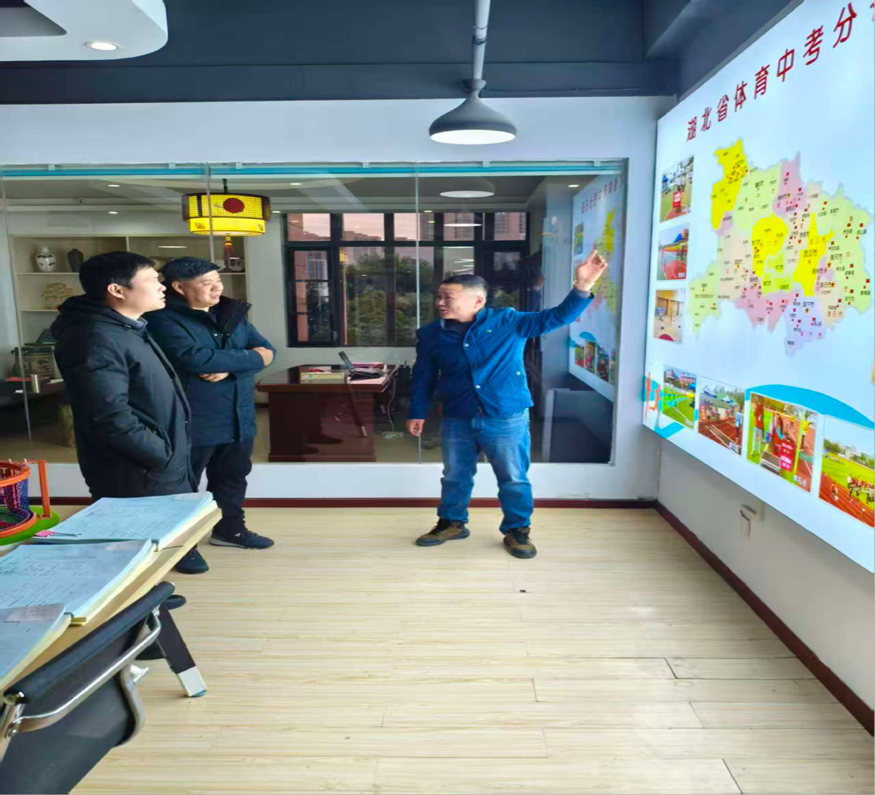 本次走访的企业包括武汉健之梦体育科技有限公司与汉晟康体育器材有限公司。在武汉健之梦体育科技有限公司的交流现场,企业负责人结合“湖北省体育中考分布展示版”向校方团队介绍体育中考配套服务的业务布局图,让校方更加清晰的了解到企业对熟悉体育中考的项目规范的人才需求。走访过程中,校方代表深入了解了两家企业的发展历程、技术优势、人才需求及未来规划,并向企业详细介绍了公司体育系的专业设置、人才培养特色及毕业生情况。
