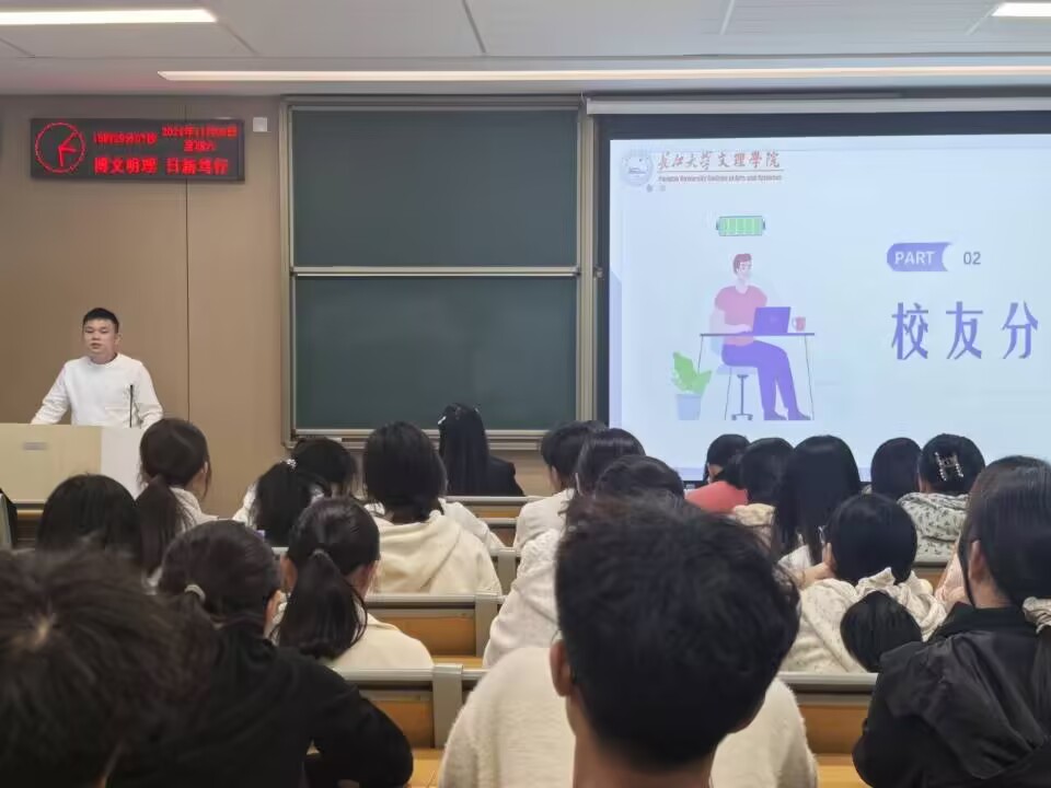分享会开始,刘江盼学姐讲述了自己的校园时光,以及毕业后扎根农村、走进基层支教的工作选择,于她而言那是最幸福的一段时光。接着李显莎学姐分享从事教育行业的经验,并回顾大学期间的在校生活。最后江超学长分享经验,毕业后赴深圳工作的经历,也提到大学期间在员工会大家庭里锻炼了自己与人交际的本领。