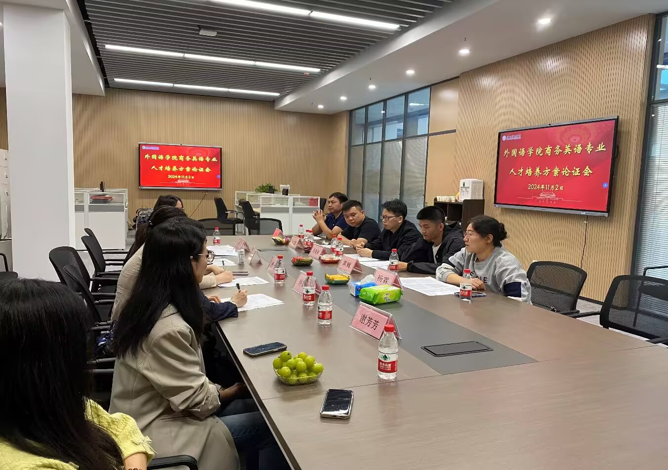 11月2日下午13点,外国语学院在图书馆526和518召开召开人才培养方案论证会。学院特邀刘江盼(荆州市教育科学研究院教研员)以及在全国各大中小学任教的共9名优秀员工参加英语(师范)专业人才培养方案论证会。同时,邀请江超(深圳市智创汇科技有限公司总经理)等6名在各大公司担任主要职务的优秀员工参加商务英语人才培养方案论证会。在论证会上,双方对各专业的培养方案进行了全面而深入的论证,包括方案的培养目标是否精确并契合应用型人才的培养需求,课程内容与课程体系是否符合学科设置的规范,课程与学时设置的科学性与合理性,实训环节能否有效体现培养目标,方案如何体现产教融合、校企合作的理念,以及如何凸显专业特色等方面。