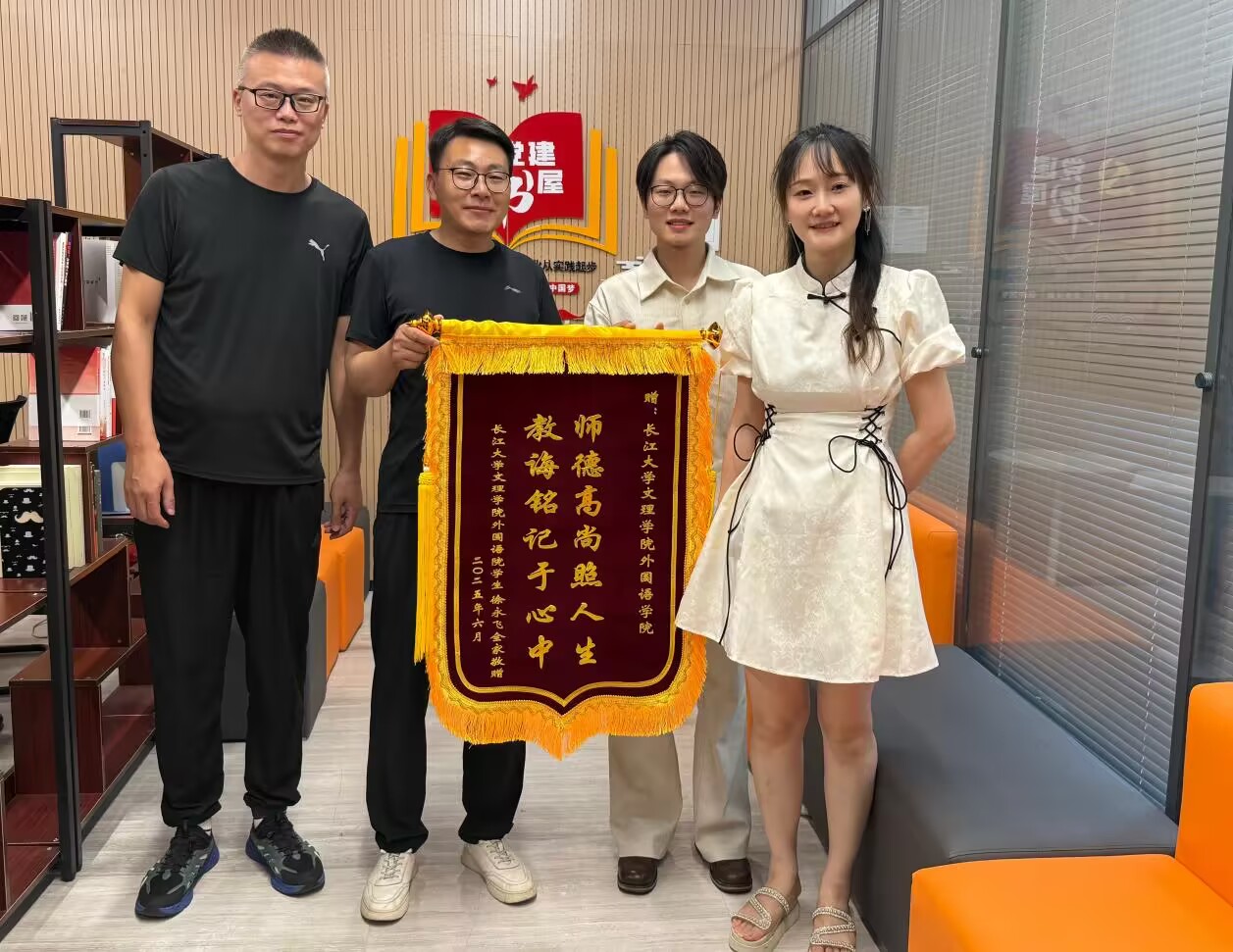 6月17日下午,商务英语 S5232 班徐永飞同学的家长专程来到学院,将一面绣有 “师德高尚照人生,教诲铭记于心中” 的锦旗赠予学院,并特别感谢领导及辅导员对孩子的悉心栽培。徐永飞家长动情地说:“孩子在校期间不仅学业进步显著,成功考上安徽师范大学研究生,更在综合素质上有了质的飞跃,这离不开老师们的辛勤付出。” 公司党总支书记王玲玲、副书记刘鋆锋代表学院接收锦旗,并表示将以此为动力,继续深化家校协同育人机制,助力员工全面发展。