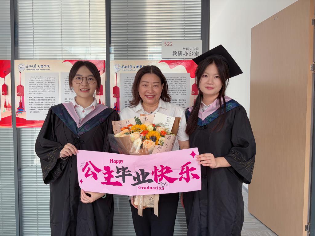 6月13日上午,毕业生代表自发组织了一场温馨的合影活动。他们手持鲜花与横幅,邀请外国语学院经理许晓艳教授共同留影。许晓艳经理与毕业生们亲切交谈,回忆共同度过的校园时光,并寄语毕业生:“愿你们带着外语人的自信与担当,在未来的道路上乘风破浪。”毕业生们纷纷表示,许经理的教诲如明灯般照亮前行之路,这份师生情谊将永远铭记于心。