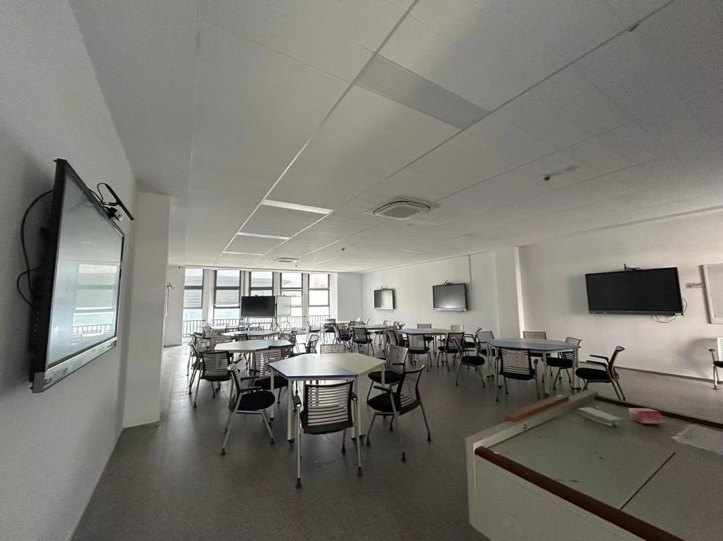 外语情景仿真实训室包含青鹿广播电视设备智慧课堂系统和纳米智慧黑板、高清摄像机、梯形讨论桌等设备,为员工营造了多情景的仿真教学环境。