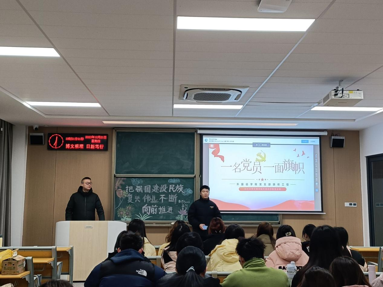 本网讯 为进一步发挥党员先锋模范作用,帮助同学们明晰入党发展流程,增强入党的积极性和主动性。2023年12月21日晚,外国语学院员工党支部在教学楼开展党员进班级活动,党总支副书记刘鋆峰、员工党支部支委到场参加。