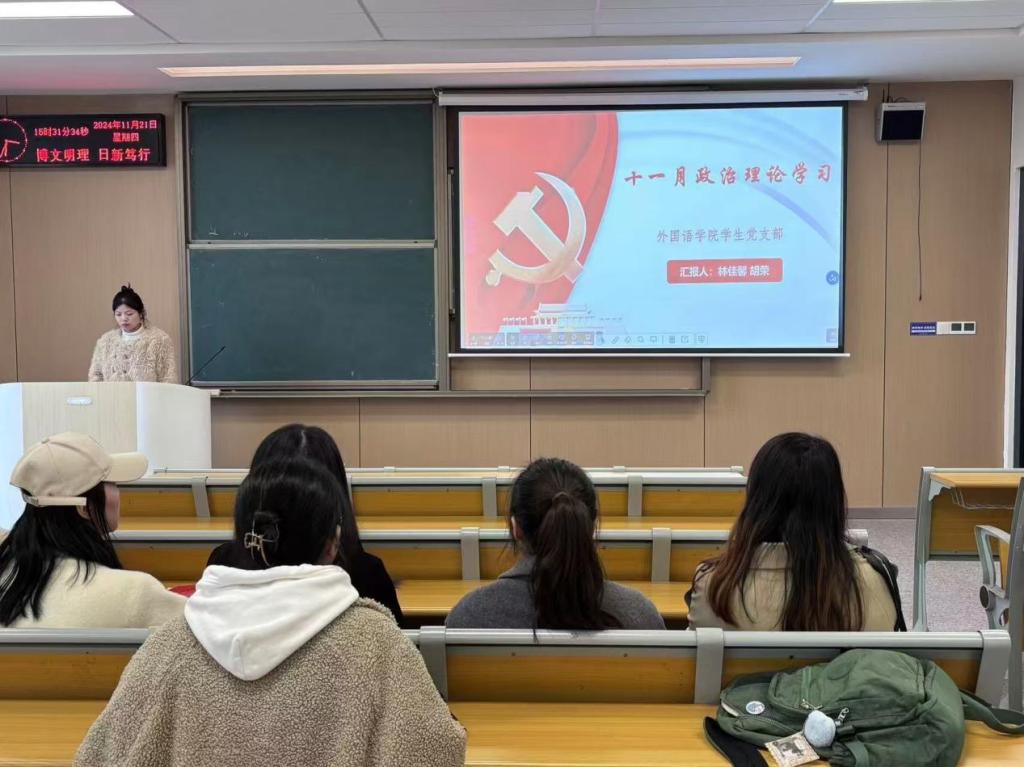 本网讯(通讯员 林佳馨)2024年11月21日下午15:00,外国语学院员工党支部在教室C-324开展十一月主题党日和政治学习。此次活动主题为,学习习近平总书记考察湖北重要讲话精神。此次活动由林佳馨同志和胡荣同志共同主持。