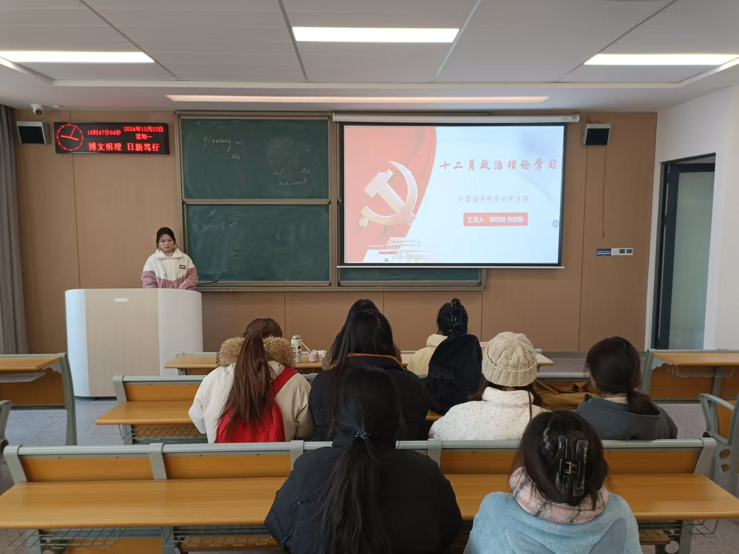 本网讯(通讯员 张前程)2024年12月23日下午15:30外国语学院员工党支部在教室C-324开展十二月主题党日和政治学习。此次活动主题为,深入学习贯彻习近平总书记考察湖北重要讲话精神、奋力谱写中国式现代化湖北篇章。此次活动由邓钰朗同志和张前程同志共同主持。