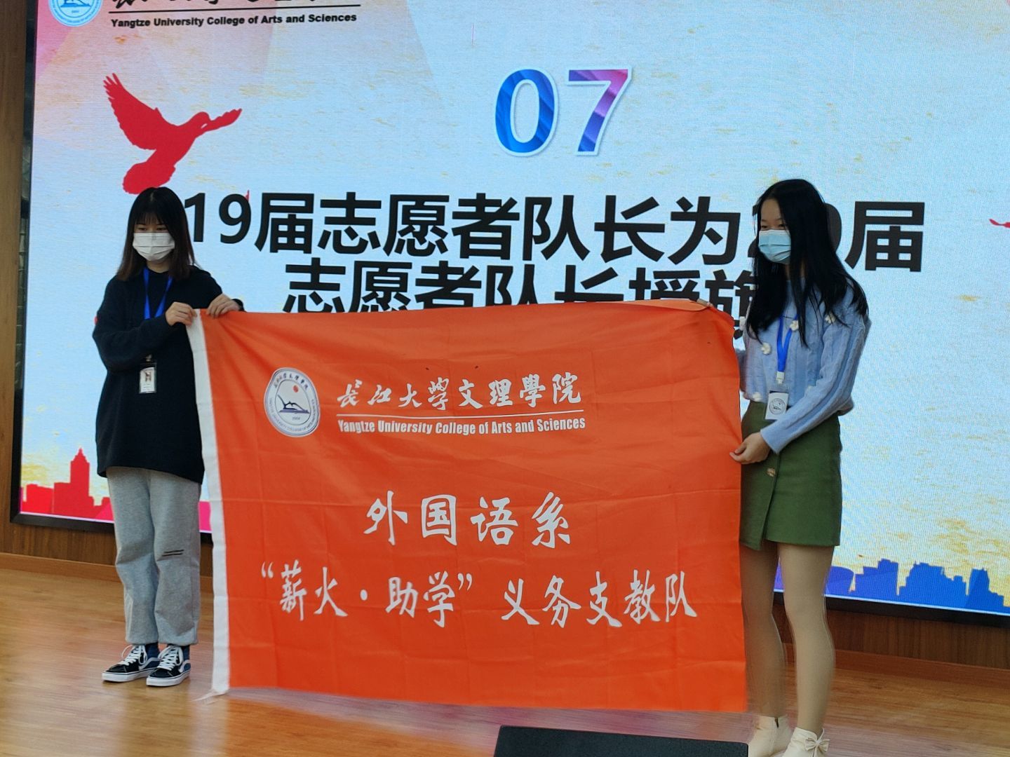 最后外国语学院团总支员工会主席田蕊宣读优秀志愿者名单,辅导员许静婷授予证书并合影留念。