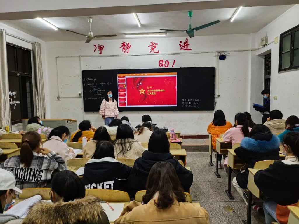 (通讯员 赵欣雨)3月11日晚上七点,外国语学院各班开展“学习贯彻两会精神”主题团课。此次团课由各班班委主持。