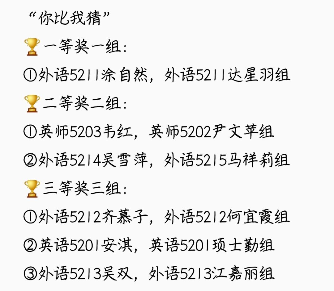“你是我的眼”、“你比我猜”、“同心协力大比拼”活动在一教教室举行。经过激烈角逐,获奖名单如下: