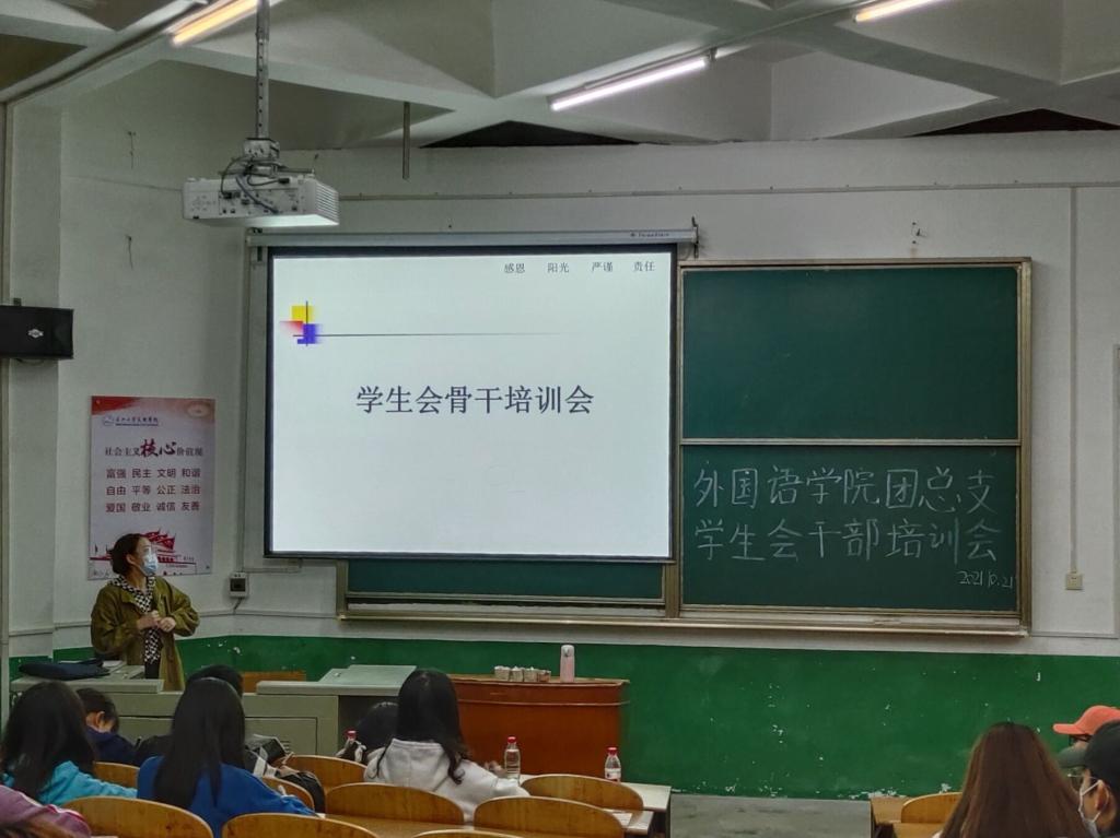 (通讯员 何宇欣)10月21日晚6点30分,外国语学院团总支员工会于2教303召开干部培训会。本次会议由组织部干事罗灿主持,辅导员雷昕、许静婷以及员工会全体成员参加。
