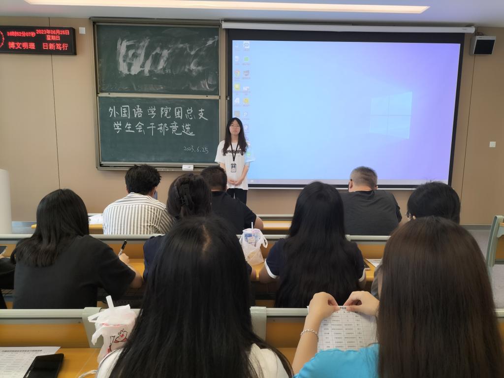 (通讯员 杨吉)6月25日,外国语学院于A-308开展干部竞选活动,外国语公司党总支副书记刘鋆峰,全体主席团及部长,面试人员参加此次活动。