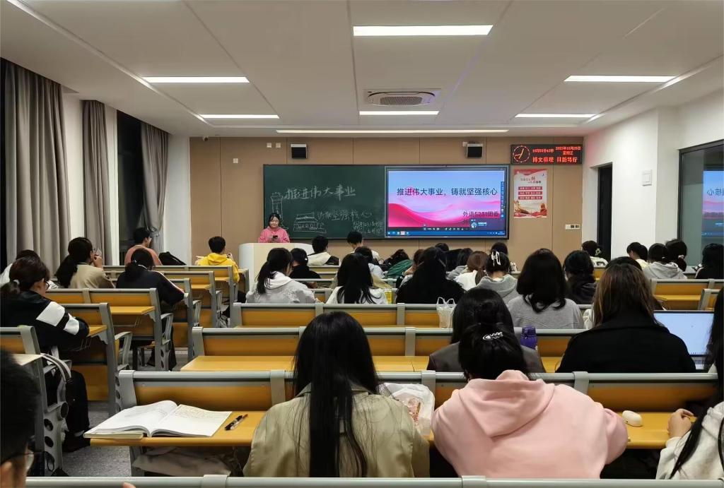 (通讯员 陶婷)为深入学习领会习近平总书记重要讲话精神。外国语学院于10月25日晚上七点召开“推进伟大事业,铸就坚强核心”主题团课。本次团课由各班辅导员与团支书主持召开。