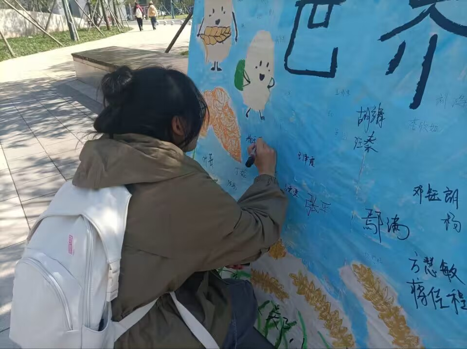 本网讯(通讯员 杨宇轩)11月7日,外国语学院团总支员工会青工部组织同学们于B栋宿舍楼前举办世界勤俭日签字活动。