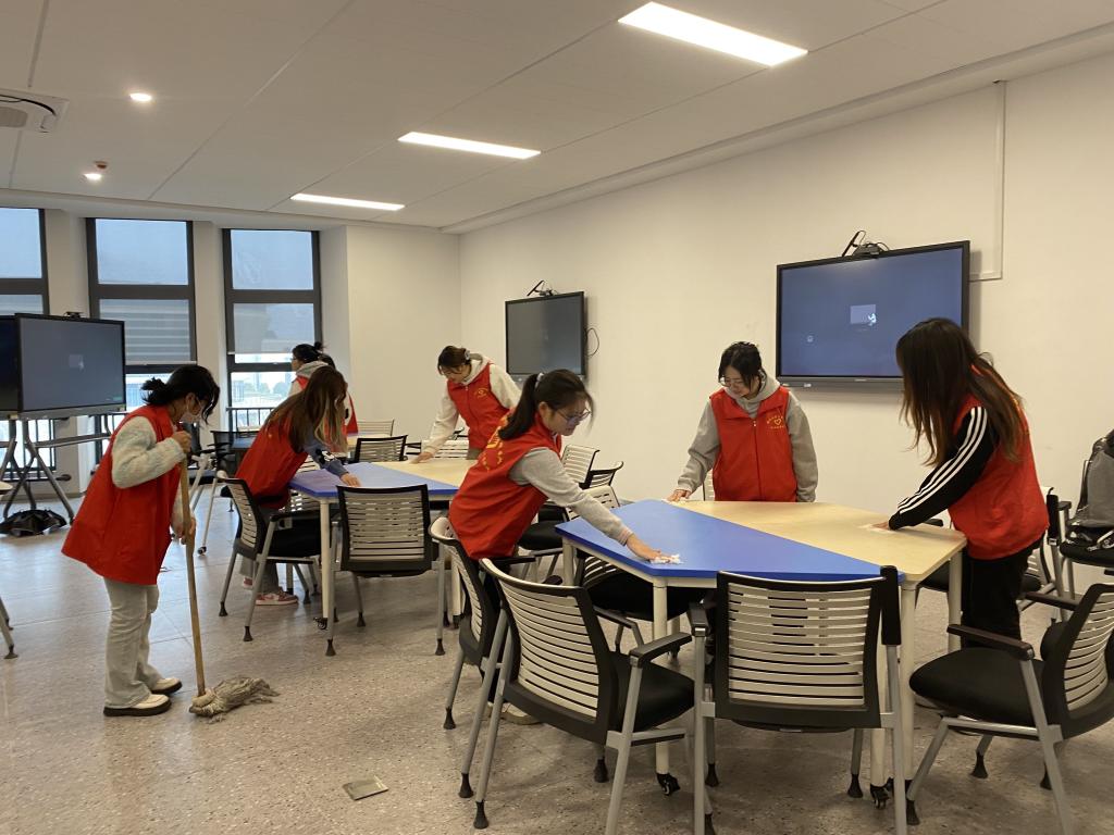 本网讯(通讯员 金玉莹)为充分发挥外国语学院团总支员工会的干部模范作用,为新生提供良好的学习环境,9月3日下午,外国语系员工会对实验楼外语教室进行了认真细致地清扫。
