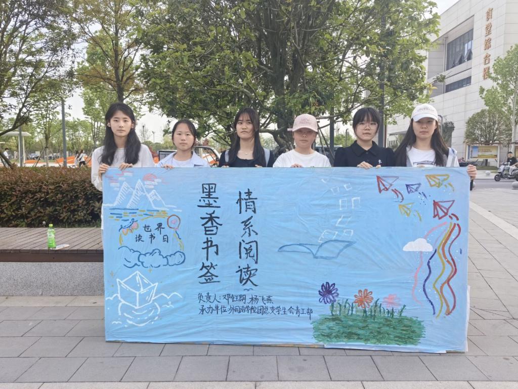 本网讯(通讯员 李胡懿)4月16日外国语学院员工会青工部于B栋宿舍楼前开展“墨香书签,情系阅读”活动。