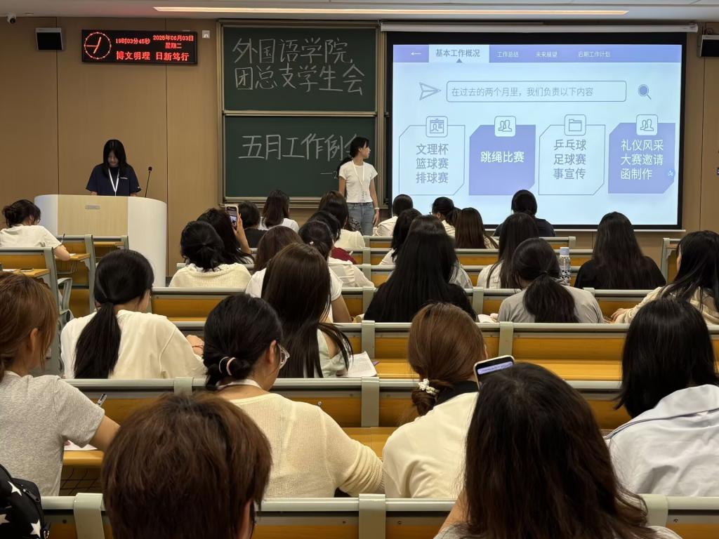 本网讯(通讯员 于佳鑫)6月3日晚七点,外国语学院团总支员工会于A-308召开五月工作例会,总结近期工作,聚焦礼仪风采大赛复盘,部署近期阶段任务,凝聚团队共识。