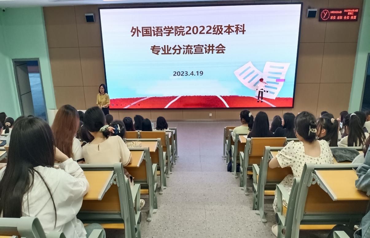 (通讯员 柏斌)2023年4月19日,外国语学院于教学楼B-214召开2022级专业分流宣讲会。外国语学院副经理韩翠萍教授、英语(翻译)方向罗丹老师、英语(师范)方向杨杨老师、英韩双语方向张乐玥老师、英日双语方向李漫琪老师、商务英语专业李琳老师、各班班主任、辅导员以及全体2022级员工参加此次会议。外国语学院副经理罗丹主持会议。