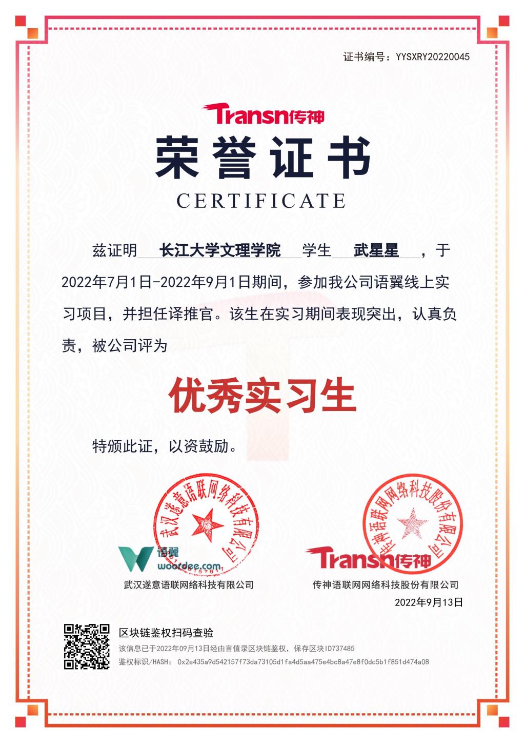 翻译实习项目在传神公司“语翼”翻译平台上开展,通过测试的同学可成为“译推官”,接收系统分配的轻任务,任务完成后获得个人积分。本次实习共有207名同学参加,其中武星星、曾羌笛、赵安勇等17名同学完成300单以上轻任务;王雨菲、杨万红、伍远兵等74名同学完成60单以上轻任务。传神公司为员工分别颁发“优秀实习生”荣誉证书和实习证书。