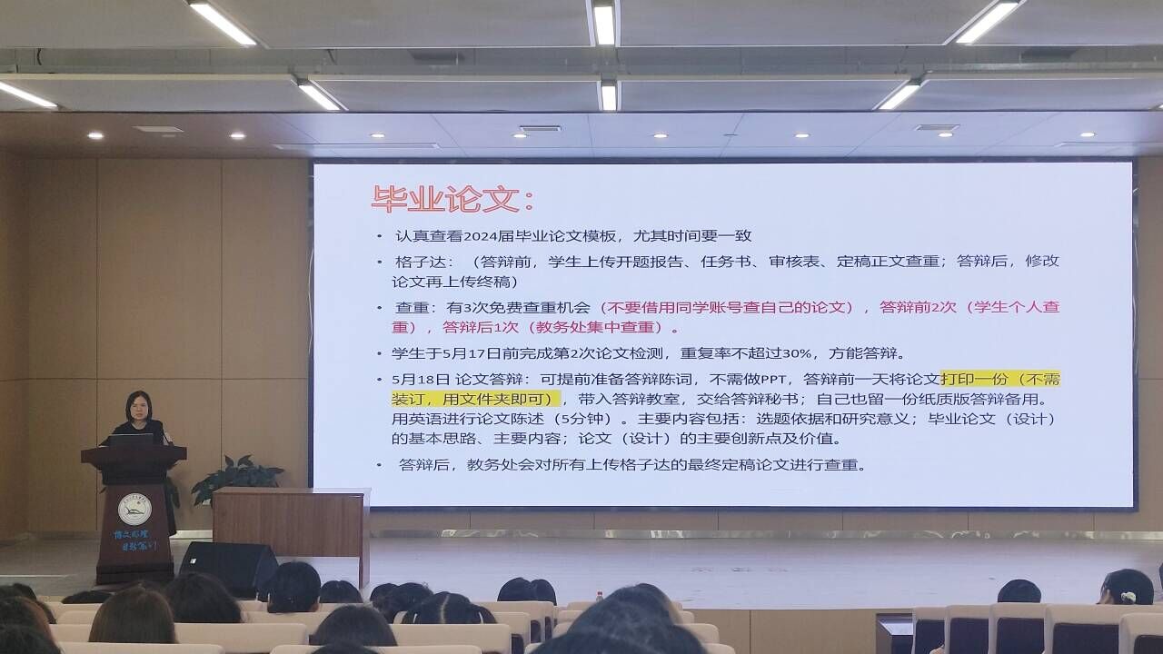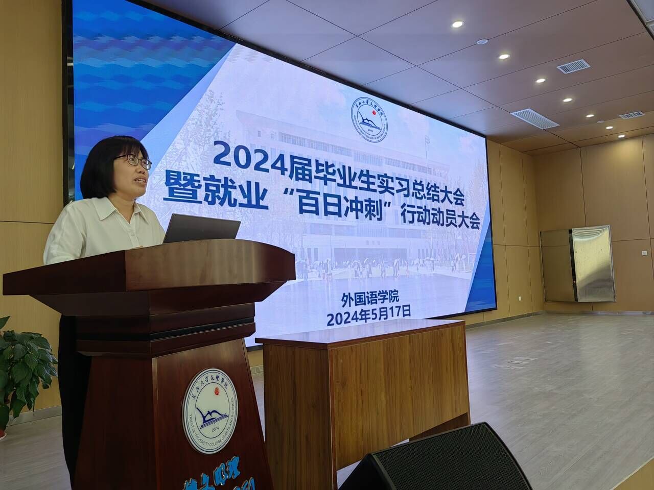 本网讯(通讯员 柏斌 许静婷)5月17日下午外国语学院在教学楼B-112学术报告厅召开2024届毕业生实习总结大会暨就业“百日冲刺”行动动员大会。外国语学院常务副经理韩翠萍、副经理罗丹、毕业班辅导员、班主任及全体2024届毕业生到场参加。会议由辅导员许静婷主持。