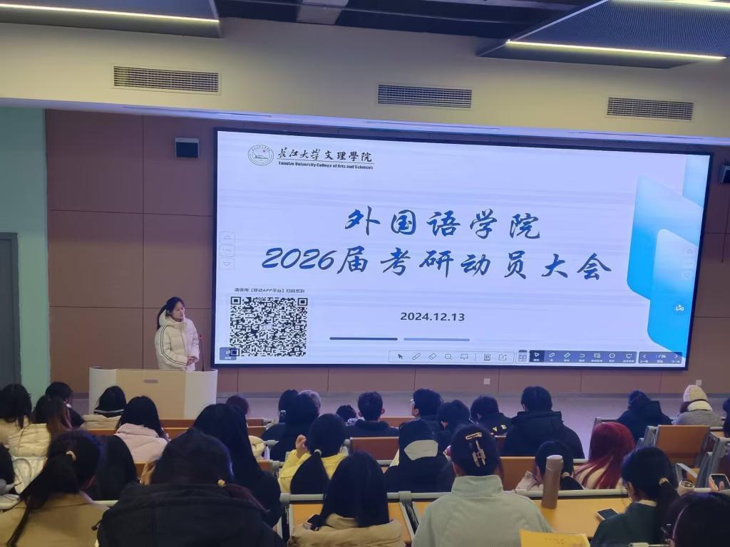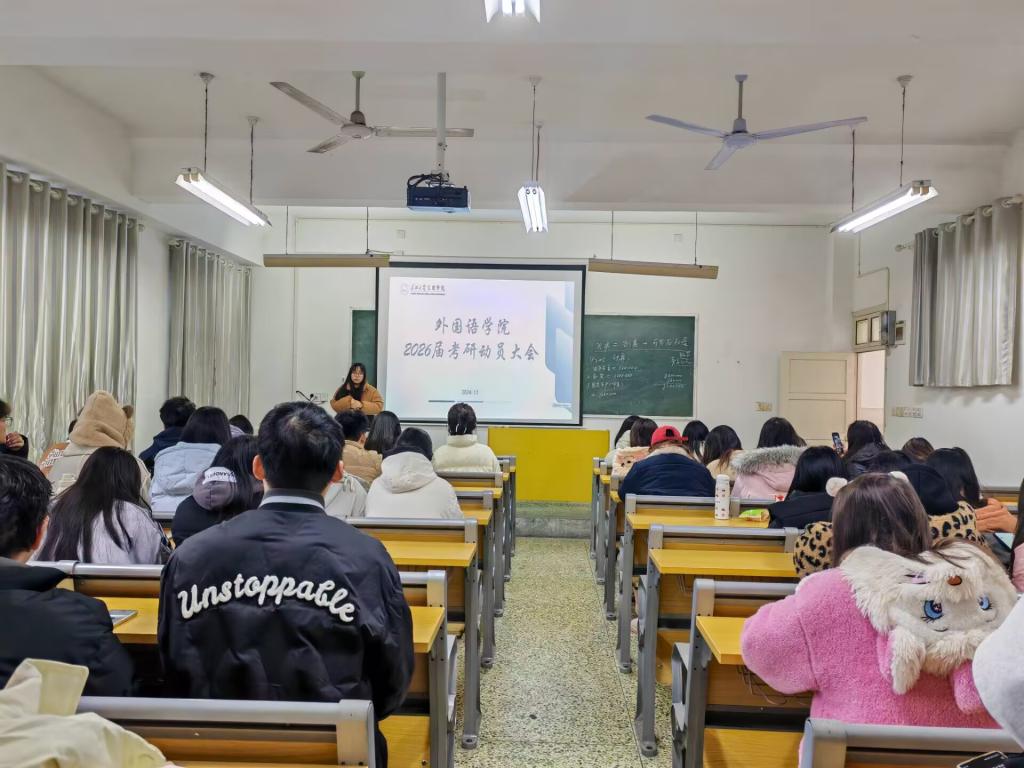 本网讯(通讯员 于佳鑫)为点燃2026届员工的考研热情,外国语学院于12月13日在B-214及12月16日在南校区教学楼511召开2026届考研动员大会。本次大会由许静婷老师主持,王玲玲书记出席,全体2026届毕业生共同参与。