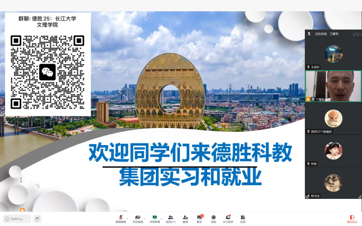 本网讯(通讯员 王金妃 钟燚)2025年4月9日晚8时,一场专为2025届毕业生量身打造的教师招聘线上宣讲会如约而至、顺利开场。本次宣讲会由外国语学院精心主办,辅导员钟燚老师担任主持,广东德胜科教集团的丁董事长亲自为同学们进行宣讲。活动消息一经发布,便吸引了外语专业、中文专业和数学专业众多怀揣教育梦想的同学积极响应、踊跃参与。
