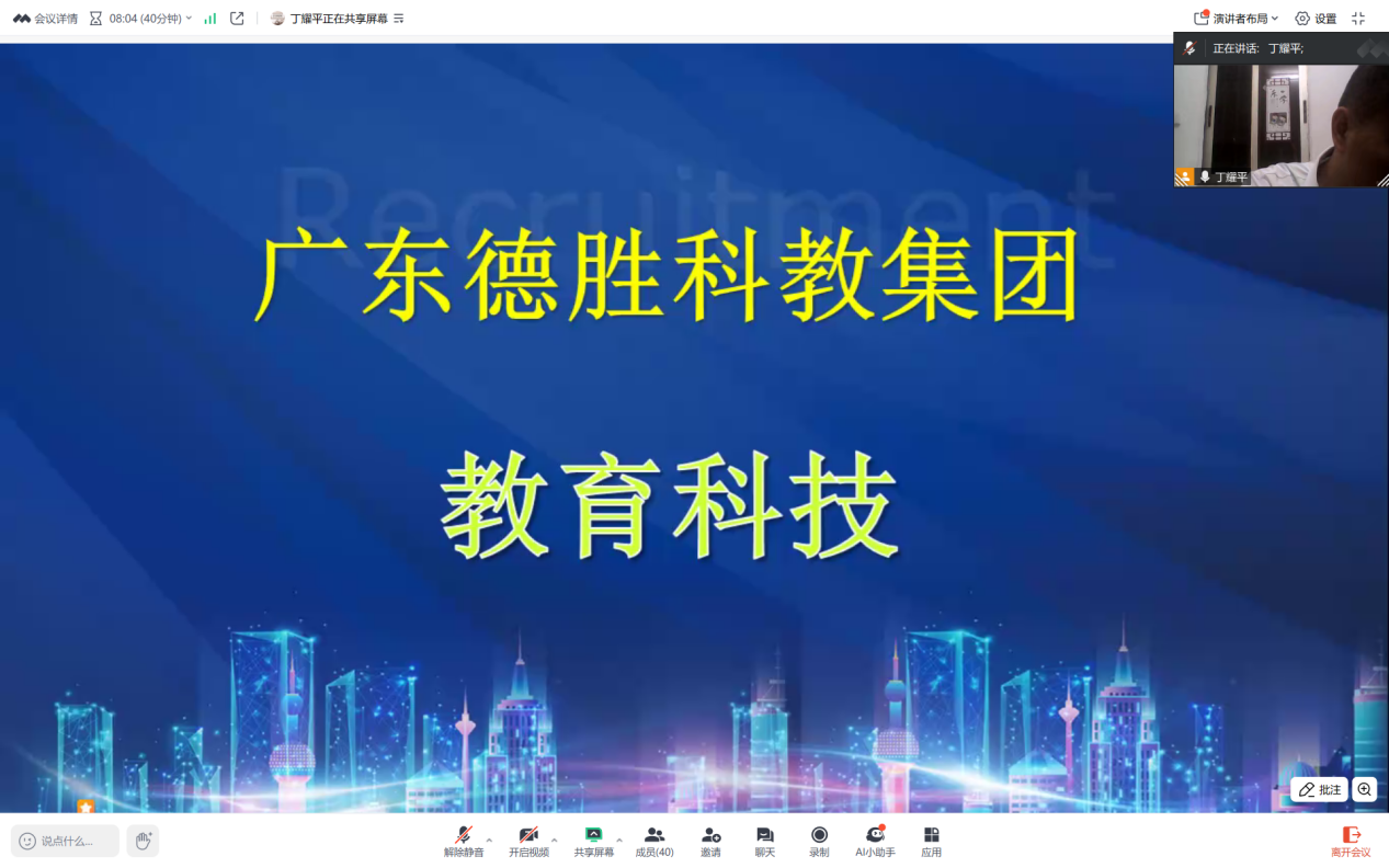 宣讲会伊始,广东德胜科教集团总董事长丁耀平通过屏幕,热情洋溢地向应届毕业生们介绍了集团的深厚底蕴与广阔发展前景。集团业务广泛,拥有优质的学校和丰富的教育资源,包括中小学、托辅中心等教学机构,致力于提供最优质的教育服务。在招聘岗位介绍环节,丁董事长详细阐述了针对应届毕业生开放的中小学各学科教师及托辅教师岗位。这些岗位为富有活力与创新思维的应届毕业生提供了广阔发展平台,涵盖语文、数学、外语等多个专业领域,满足不同专业员工的求职需求。薪资福利方面,集团尽显诚意,实行年薪制,提供五险一金,更有带薪年假、节日福利等。同时,高度重视教师职业发展,搭建完善的职称晋升通道,定期组织专业培训与学术交流活动,助力教师不断提升专业素养,实现职业理想。