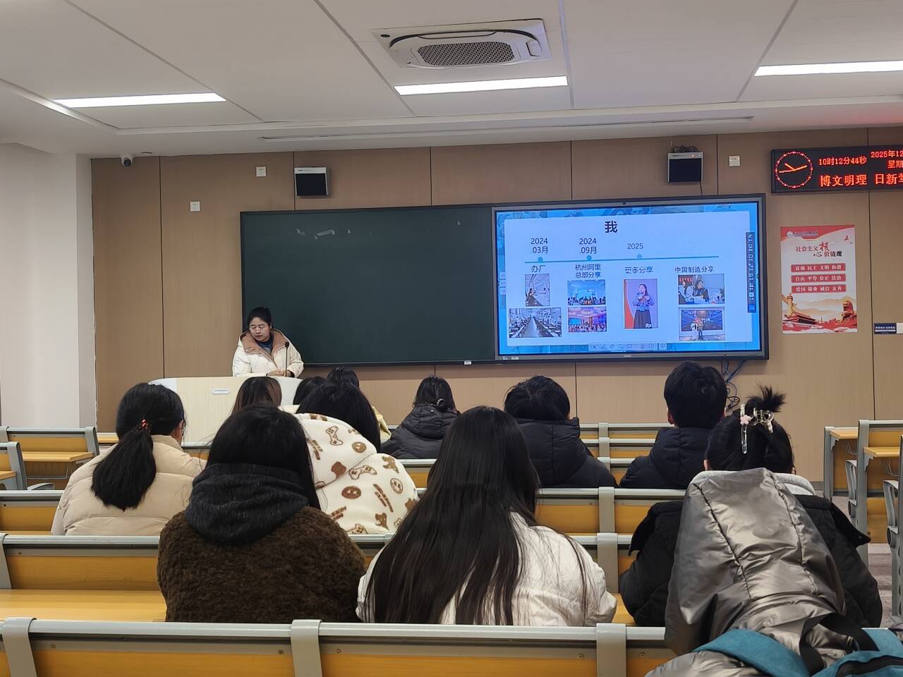 宣讲会上,潘总结合自身丰富的行业经验,详细分享了自己在外贸领域的从业历程与深刻认知。从初入行业的探索积累,到深耕领域的突破成长,她的分享生动鲜活,不仅让同学们直观感受到外贸行业的发展魅力,也为大家未来的职业规划提供了宝贵的参考样本。同时,还系统介绍了公司的发展历程、核心业务布局、行业竞争优势以及未来发展规划,让同学们对企业有了全面且深入的了解。