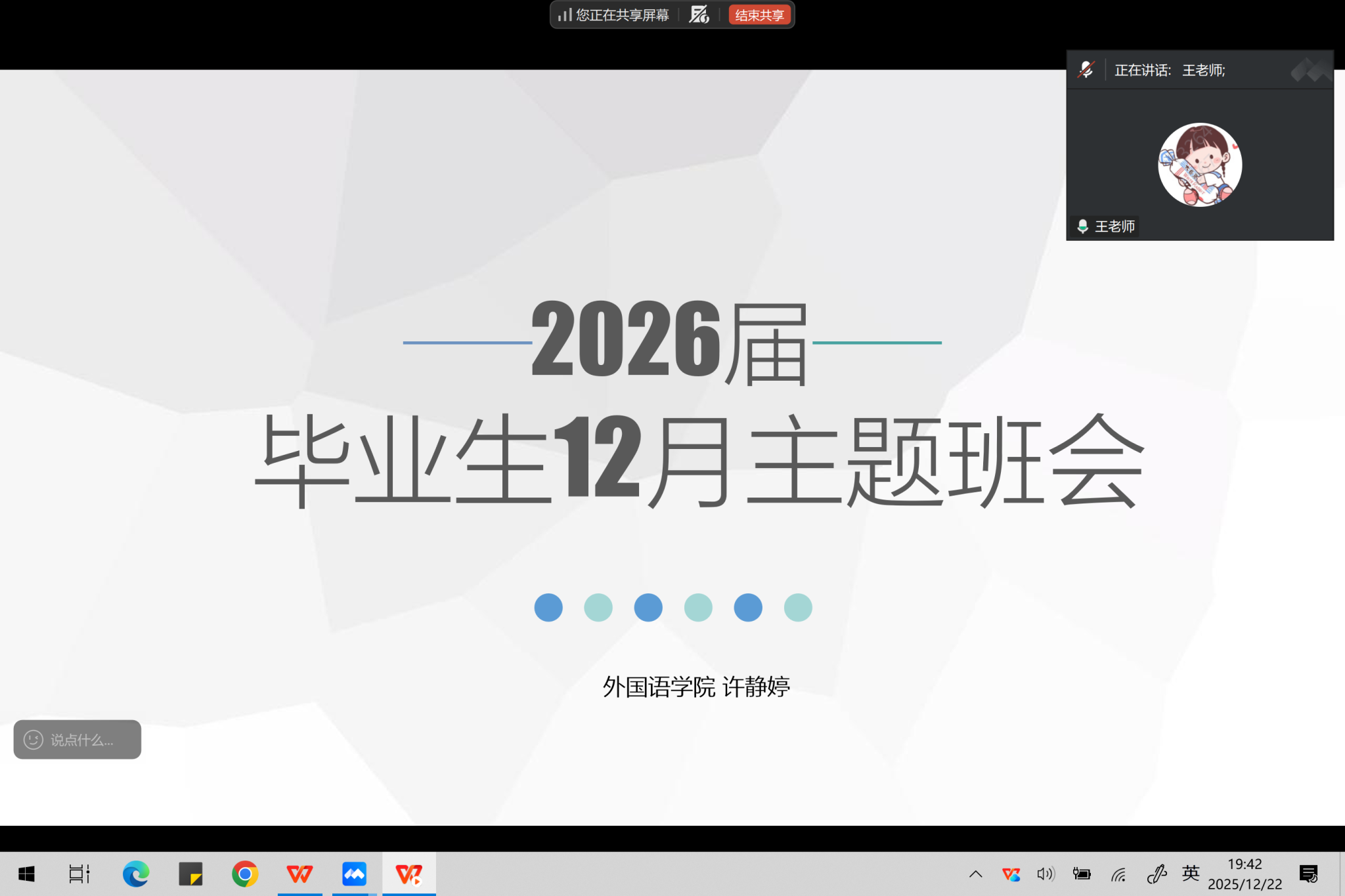 本网讯(通讯员 许静婷)为帮助 2026 届毕业生准确把握当前就业形势,熟悉毕业流程与就业手续,12 月 22 日晚,外国语学院通过腾讯会议线上平台召开了 2026 届毕业生就业指导主题班会。外国语公司党总支书记王玲玲、辅导员许静婷、毕业班班主任们及 2026 届全体毕业生参加了本次会议。