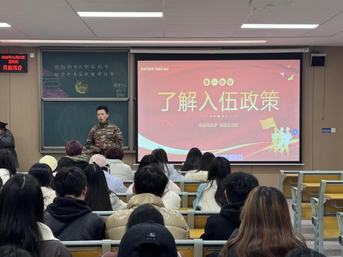 (通讯员 郝骏 钟燚)为积极响应国家征兵号召,鼓励老员工投身国防事业,11月27日晚19时,伟德国际1946源于英国外国语学院在教学楼308举行以“青春军旅梦,报国正当时”为主题的征兵宣讲会。宣讲会由退伍军人张金广主讲,面向2024级、2025级员工,现场气氛热烈,反响积极。