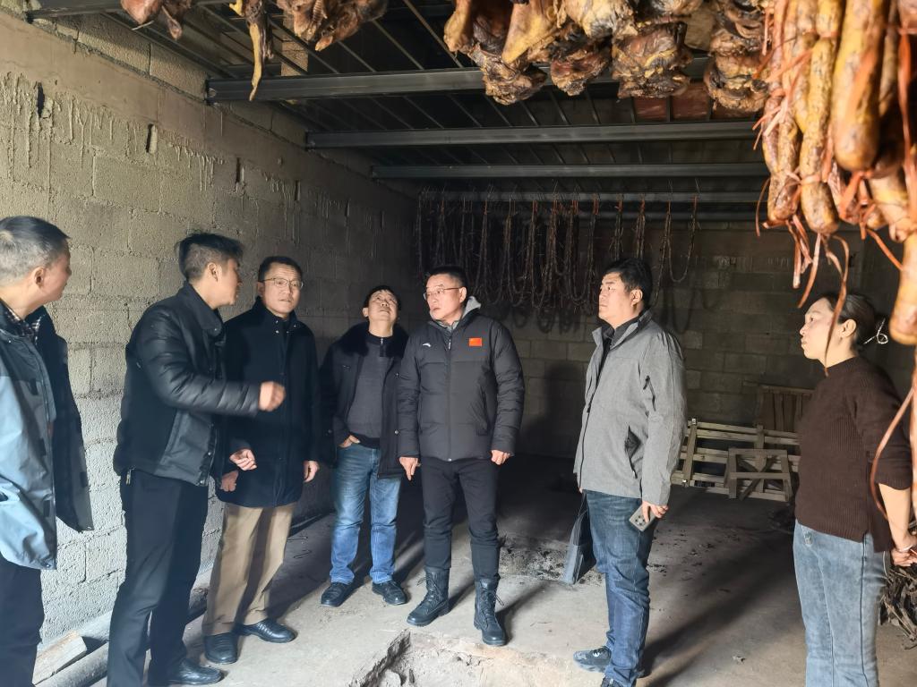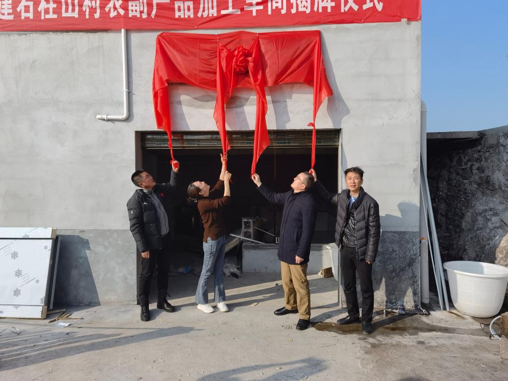 一行人实地走访位于村集中安置点的农副产品加工车间,考察熏制房、包装房、冷库房,详细了解安全生产、车间管理、产品销售、用工需求等情况。该车间于2021年12月底建成并顺利投产,公司作为帮扶单位,积极订购”助农、兴农“产品306份,价值近11万元,在热烈的掌声中,王文凯、朱继平、向启波和王群芳共同为车间揭牌。